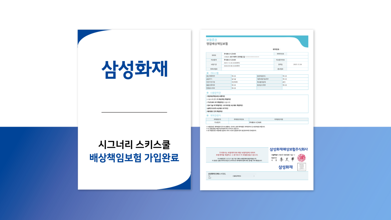 시그너리스키스쿨은 최상급의 보상 품질로 구성된 배상책임보험이 가입된 정식 강습 사업장입니다. 안심할 수 있는 강습 환경을 조성하여 안전중심의 강습을 실천합니다.